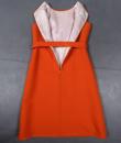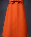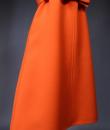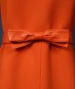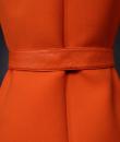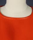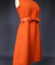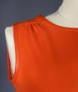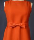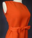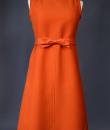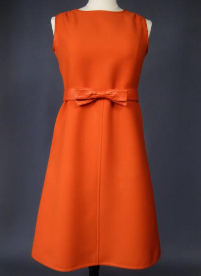 Courrèges Haute Couture day dress in thick orange jersey from the early 1970s. Straight sleeveless cut, pleated tabs at the shoulders and slightly flared on the skirt with vertical stitched seams. Minimalist simplicity with unique piping effect in matching leatherette vinyl at the shoulders and bardot collar. Orange Belt with flat bow in matching orange vinyl fixed by hooks. Lining in white nylon and zip at the back. Label white background black graphics Courrèges Paris Couture Future Made in France numbered 0045426. Perfect condition of color and conservation.