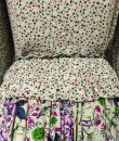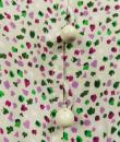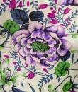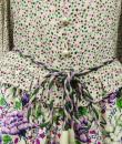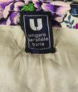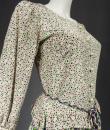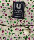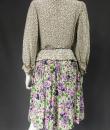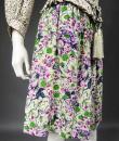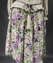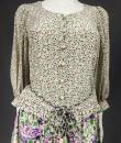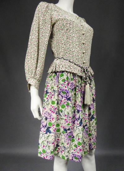 Ungaro Parallel skirt, blouse and belt set from the late 1970s. Interesting floral print on silk for the skirt and random pattern for the ruffled blouse. For the skirt, naturalistic flowers decor with large peonies, lily of the valley and roses in shades of green, purple, red, black and fuschia on a cream background. Assorted color belt in braid trimmings and tassel cream pompoms in assorted bakelites. Blouse with puff sleeves and cuffs tightened by tabs and round buttons in cream bakelite identical to those closing the blouse. Short skirt ruffled and gathered at the waist. It closes at the back by zip and hook. Unlined blouse and lined nylon skirt. Label Black background white graphic Ungaro Parallel Paris. Excellent condition of color and conservation.