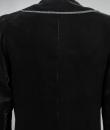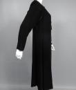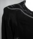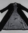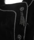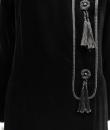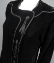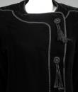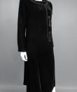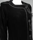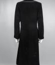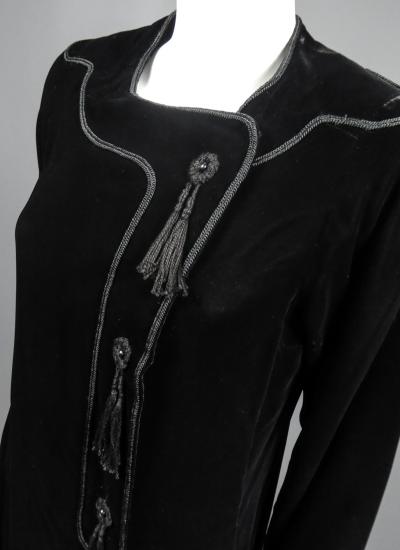 Little black dress in velvet panne by Emanuel Ungaro Haute Couture numbered 4383-10-76 from the 1976 Collection of the famous Couturier. In line with the inspiration of Yves Saint Laurent's Ballets Russes, this dress is open in front as a wrap or redingotte. Straight cut, loose, long sleeves and two side slit pockets. Inspiration from the male wardrobe thanks to the trimmings appliqued in black silk braid highlighting the collar, the shoulders and the long side tab decorated with three macarons with beaded pompoms. Closure not visible by snaps covered with taffeta in Haute Couture finishes. Lining in black duchesse silk satin.Label white background lblack graphics indicating Couture Emanuel Ungaro Paris. On the back of the label, a handwritten cotton tap indicating 4383-10-76 and confirming the reference of the Couturier's 1976 collection. Very beautiful shine of silk velvet. Very good condition of color and conservation.