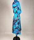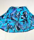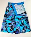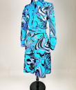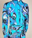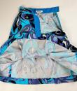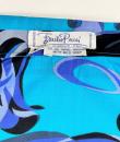 Blue-printed cotton blouse and skirt set from the famous Emilio Pucci fashion house in Florence, dating from 1970/80. Long-sleeved, slim-fit blouse in cotton voile printed in shades of turquoise to lavender blue and underlined in white and black with the Emilio signature. V-neck with turned-down panels, fastened at front with pareil-covered buttons. Matching skirt in thicker cotton twill with wide pleats for fluidity. Zip fastening on one side. No lining and white label with blue lettering indicating Emilio Pucci Florence - Italy Made in Italy 100% Pure Cotton. No holes or stains, little worn. Good condition.