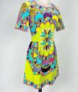 Iconic little dress in printed velvet from the famous Emilio Pucci fashion house in Florence, dating from the 1970s. Fitted cut, oval neckline, short sleeves, zip at the back and pleated skirt for ease of movement. Cotton velvet print with a “Bijoux” design in shades of apple green, fuchsia, turquoise, yellow and purple, giving the impression of a joyful firework display! The Emilio signature is repeated in several places on the dress. Fully lined with white nylon (snag on the lining at the bottom of the skirt) and white label with blue lettering indicating Emilio Pucci Florence - Italy Made in Italy 100% Pure Cotton. Note a few tiny and rare rust spots (see the last three photos), the only flaw to report. Good overall condition in terms of color and preservation.