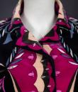 Blazer jacket and skirt set in velvet cotton with psychedelic patterns in shades of pink, beige, midnight blue, brown and black by Emilio Pucci and dating from the 1980s. Short and fitted acket with small collar closing at the front with four pearly buttons hidden inside the jacket. High waist skirt flared and slit. Closure of the skirt on the side by zip and snap. Label white background blue graphic Emilio Pucci Florence - Italy Made in Italy 100% Pure Cotton. Excellent condition of color and conservation.