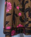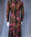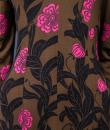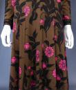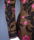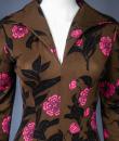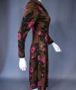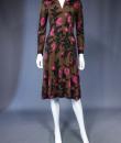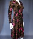 Mid-season Emilio Pucci dress in brown silk jersey printed with pink flowers and black leaves from the 1990s. Low-necked skin-tight dress with wide collar widening from the waist for a fluid skirt. Long sleeves ending in the same flowery pattern in the opposite direction that we found in the bottom of the skirt. Closure of the dress by zip on the left side. Lining of the bottom of the dress in white thermo-tight  jersey for the maintenance of the skirt. Label white background green graphics Emilio Pucci Florence Italy 100% pure silk Made in Italy indicating size 6 Italy. Excellent condition of color and conservation.