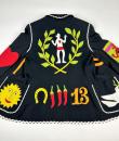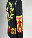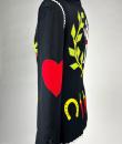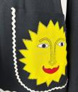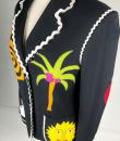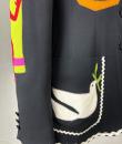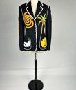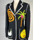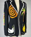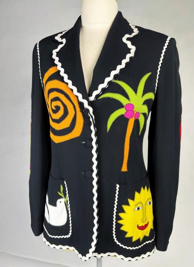 Iconic Cheap and Chic by Moschino jacket from the most creative period of Franco Moschino, who died in 1994. Slim-fit jacket in black acetate crepe with folded-down collar and long sleeves. Fully piped with white cotton croquet to emphasise the cut. Applied embroidery in bright yellow, orange, green, red and yellow, forming hearts, palm trees, sunshine, doves and human figures in swimming costumes! A mischievous, satirical nod to the works of painters Henri Matisse, Georges Braques and Picasso. Front fastening with three buttons covered in the same material, with three small buttons on the cuffs. Lined in white and black striped rayon silk, with the label Cheap and Chic by Moschino, Made in Italy. No flaws. Very good colour and condition.