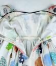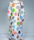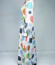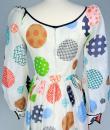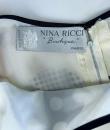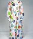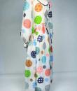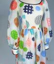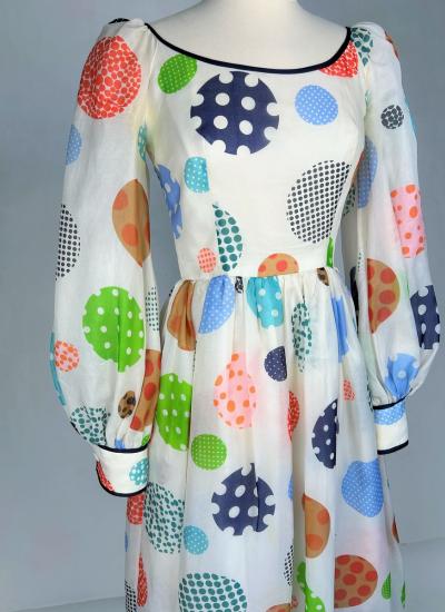 Psychedelic long dress in printed organza by Nina Ricci, directed by Gérard Pipart, from the 1973 collection. Dress with curved bustier, long puffed sleeves and boat neckline trimmed with black silk bias binding and echoed at the buttoned cuffs and bottom of the skirt. Back zip fastening. Skirt with large bottom and white nylon underskirt. The white organza fabric features large circles with multicoloured polka dots in a random pattern. White nylon bodice lining and label indicating Nina Ricci Boutique Paris, Made in France. No visible flaws apart from armpit rings and a small, barely visible ring on the skirt (see last three photos), the only flaws to be noted. Good general condition in terms of colour and conservation.