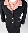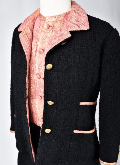 Beautiful wool and pink and gold lamé skirt and blouse suit attributed to Gabrielle Chanel Haute Couture Circa 1960/1970. Named Hortensia with Lurex silk from Bucil Manufacture (see last picture). Jacket and skirt in wool mohair with black buckles, complete with its brass buttons engraved with a lion's head. Straight skirt with double zips in the back. Black silk pongee lining and brass chain appliqué to plump up the jacket. Sleeveless crew neck blouse with eight buttons covered in a superb gold lamé design in pale pink and pink striped and mottled silk (one button missing at the waist). The lamé is repeated on the collar of the jacket and on the facing of the four pockets and the cuffs. No label (as is often the case) but obvious stitching finish allowing the attribution to the House of Chanel. Note a small tear on one sleeve of the jacket on 0.5 cm not very visible, otherwise good structural condition of the whole. Between Fair to Good general condition. More to display than to wear.