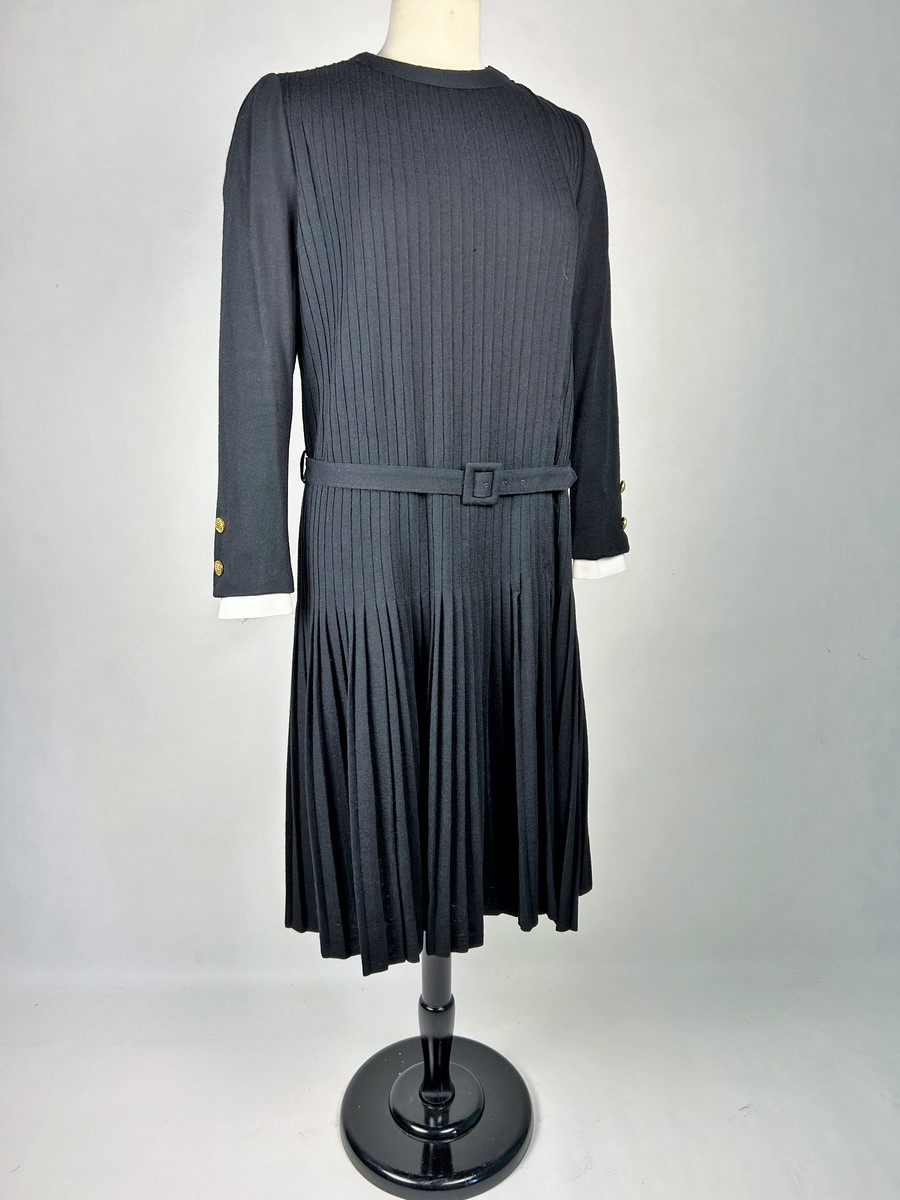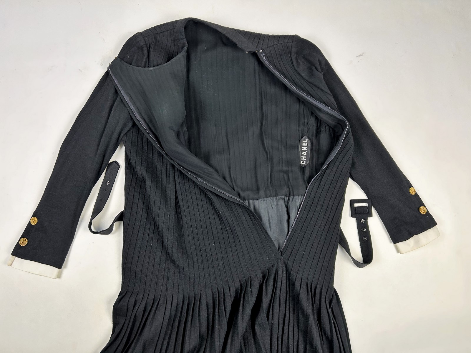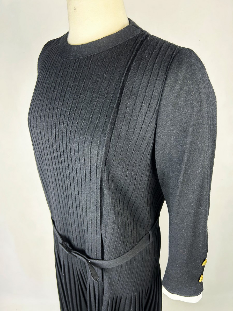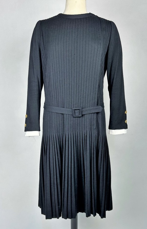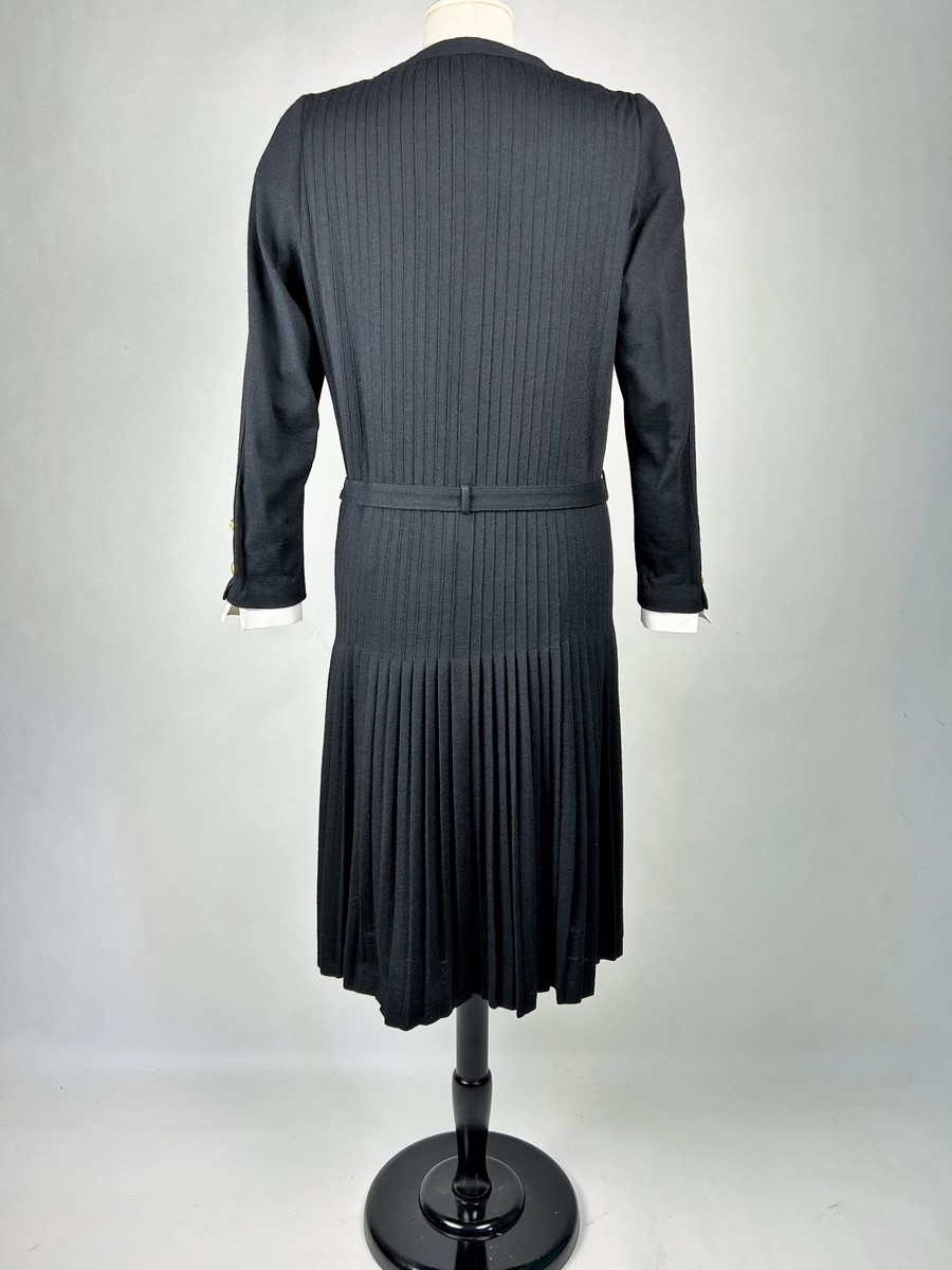 Rare ‘Little Black Dress’ by Gabrielle Chanel Haute Couture in black wool jersey, dating from Mademoiselle Chanel's final years before 1971. labelled and numbered 39634, it comes from the haute couture collections between 1969 and 1971. It is a great classic, named the Ford of Chanel in the 1920s by President Henry Ford. Here, this classic model plays on feminine ease and codes borrowed from the male wardrobe with the tuxedo and black and white. A simple, straight dress, crossed at the front with a zip and hooks at the shoulder, long sleeves and cuffs in white silk ottoman highlighted with four knitted-style gold brass buttons. Vertical topstitching unfolds into pleats in the skirt from the hips down. A matching low-waisted belt with loops, lined with grosgrain, and a buckle engraved on the reverse with the SGDG, Sertissage patent. Black silk taffeta lining for the skirt and CHANEL label sewn on one side of the bust with a cotton ribbon on the front bearing the number 39634. No flaws to note apart from two or three tiny moth holes that have been stabilised. Very good colour and condition. This dress is wearable given its condition, but above all it is a collector's item!
