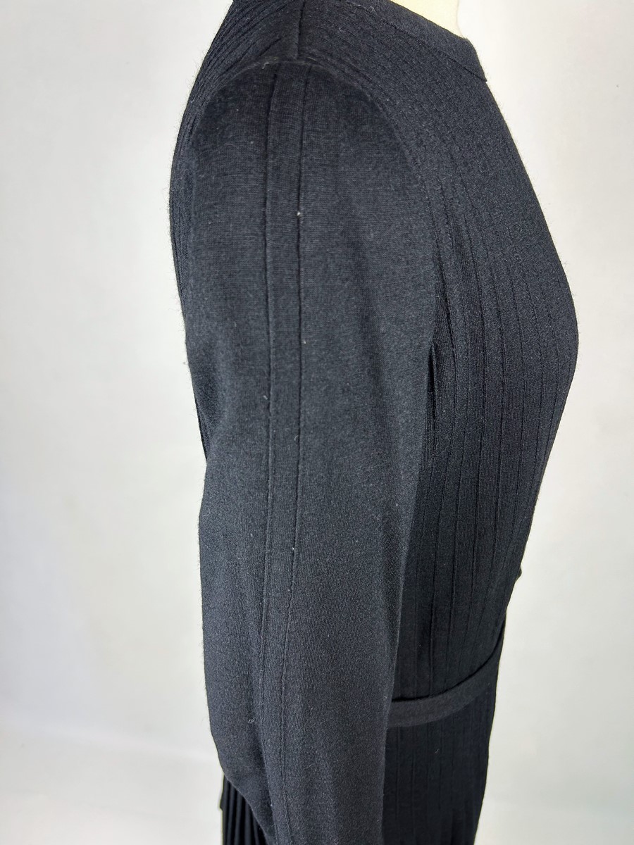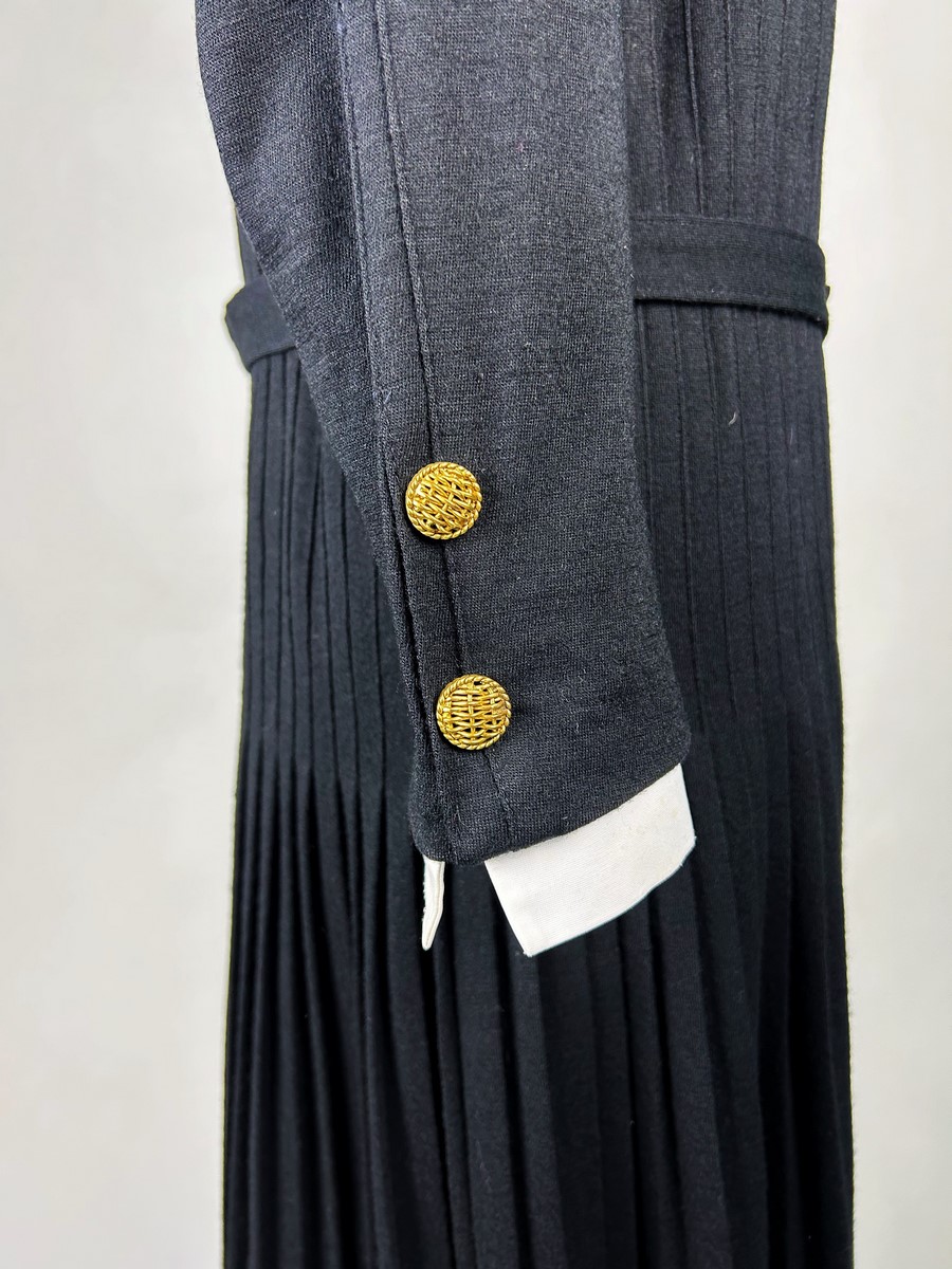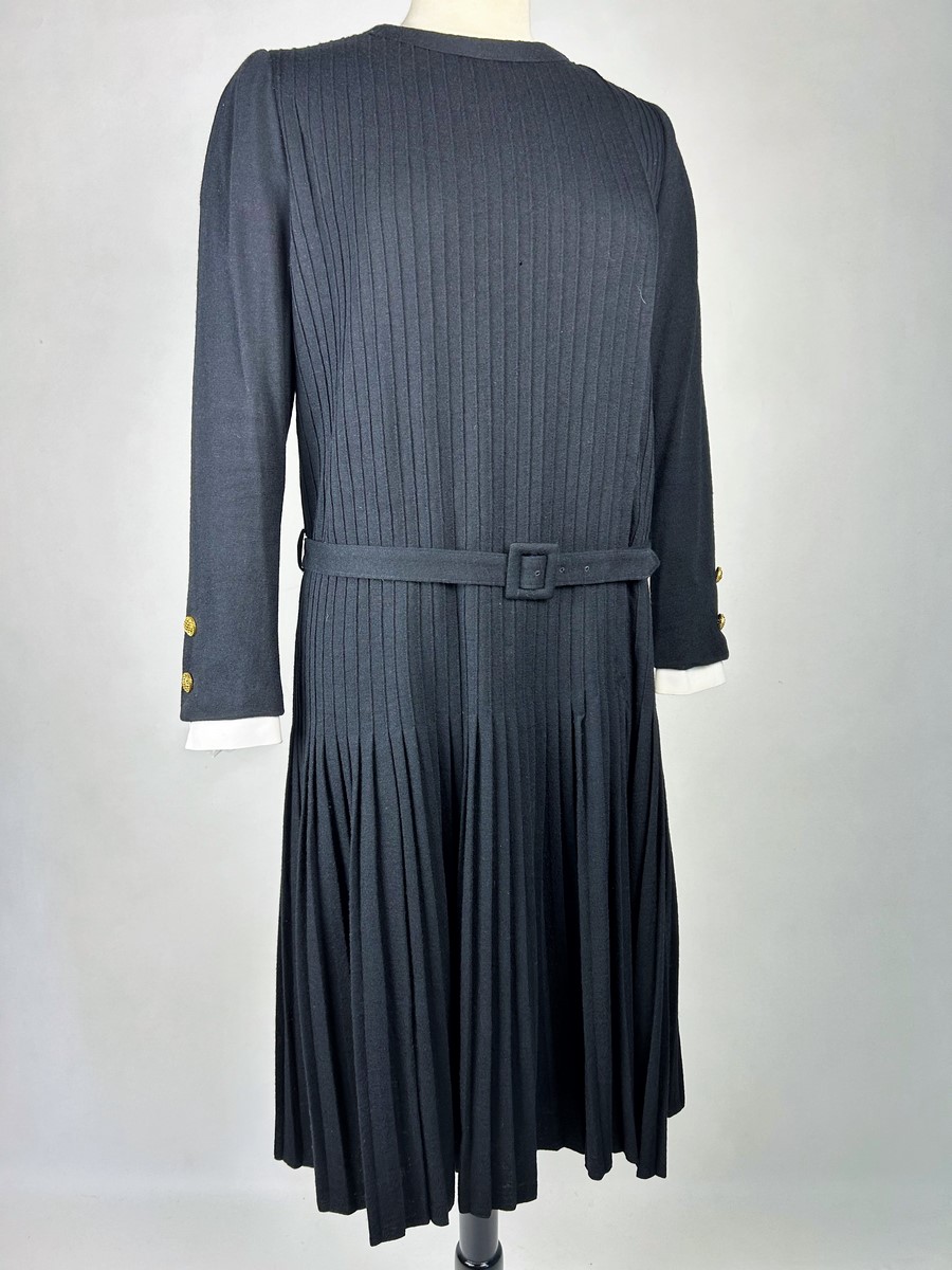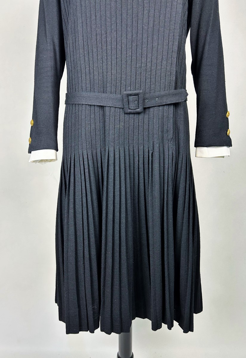 Rare ‘Little Black Dress’ by Gabrielle Chanel Haute Couture in black wool jersey, dating from Mademoiselle Chanel's final years before 1971. labelled and numbered 39634, it comes from the haute couture collections between 1969 and 1971. It is a great classic, named the Ford of Chanel in the 1920s by President Henry Ford. Here, this classic model plays on feminine ease and codes borrowed from the male wardrobe with the tuxedo and black and white. A simple, straight dress, crossed at the front with a zip and hooks at the shoulder, long sleeves and cuffs in white silk ottoman highlighted with four knitted-style gold brass buttons. Vertical topstitching unfolds into pleats in the skirt from the hips down. A matching low-waisted belt with loops, lined with grosgrain, and a buckle engraved on the reverse with the SGDG, Sertissage patent. Black silk taffeta lining for the skirt and CHANEL label sewn on one side of the bust with a cotton ribbon on the front bearing the number 39634. No flaws to note apart from two or three tiny moth holes that have been stabilised. Very good colour and condition. This dress is wearable given its condition, but above all it is a collector's item!