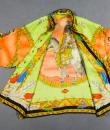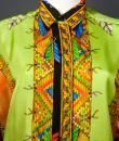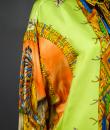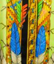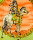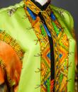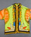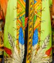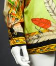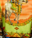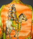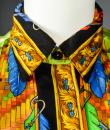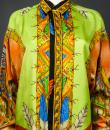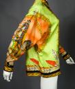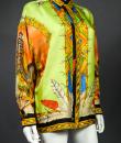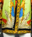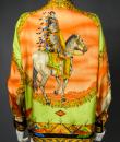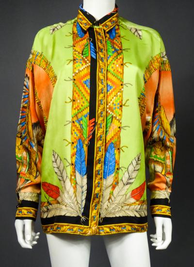 Rare Haute Couture shirt in silk twill printed with baroque and eccentric Indians by Donatella Versace from the years 2004/2011. Loose and fluid cut printed with the Atelier Versace logo which has been associated since 2004 with the red carpet and Haute Couture. Small collar with lapel and long sleeves. Printing on silk with strong polychromy representing an Indian with feathers from behind on horseback facing a sunset. Variation of the theme excessively on the sleeves and front with large baroque medallions of feathers and jewelry. Closure with buttons hidden by a tab and decorated with black pearl jewelry button on the cuffs and the collar. Label woven on black background with white graphics Gianni Versace Couture Made in Italy. Very good condition of color and conservation.