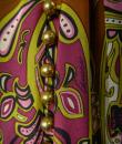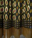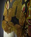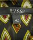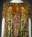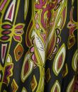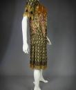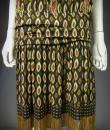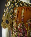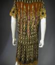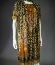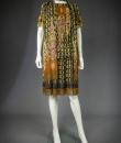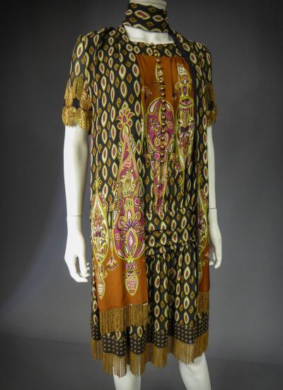 Straight jewel dress inspired by Art Deco in silk with multicolored boteh patterns on a black background lined with black taffeta. Round neckline underlined with a cashmere print in shades of pink, fuchsia and mauve on a brown background. Zip on the hips and front closure by 19 spherical brass buttons. Appliques embroidery of golden brass chains and faceted pearls on the sleeves. Flexible skirt without marked size embellished with a fake belt draped over the hips. Bottom of skirt covered with brass and fringes of chains. Scarf in the same fabric lined in silk crepe with fringes of chains at the ends. From the Fall / Winter 2008 - 2009 collection, Look # 26. Black label White graphic Gucci Made in Italy. Excellent condition of color and conservation.