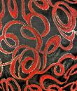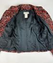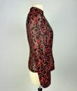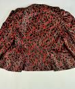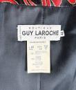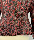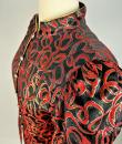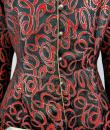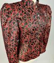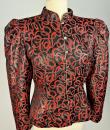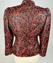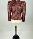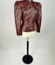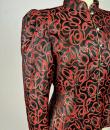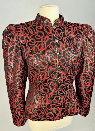 Shoulder-length jacket in lamé polyester by Guy Laroche dating from the Disco years around 1985. Radiant lamé on a black background with a swirl pattern of red and gold streamers. Fitted jacket with a small turned-up officer's collar and puffed sleeves with small pleated shoulders. Gold lamé piping highlights the collar and front of the jacket, which is fastened with seven finely chased brass ball buttons. Black nylon lining and white label with black lettering indicating Boutique Guy Laroche, Paris, Made in France, size 46. A few very rare pulled threads but no visible wear or dirt. Little or no wear. Good overall condition.