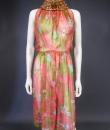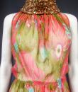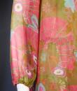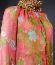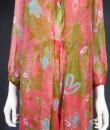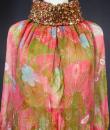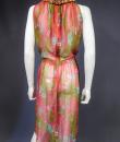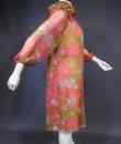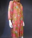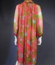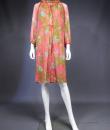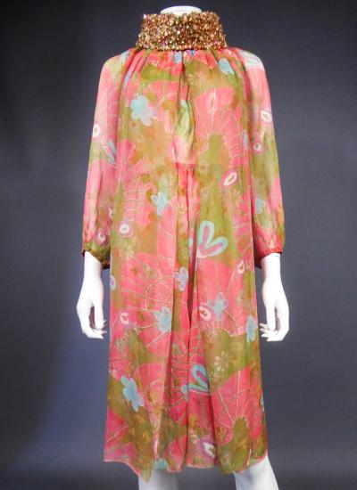 Beautiful evening set made by Guy Laroche in printed silk crepe dating from the years 1965/1970. Sleeveless dress with high mandarin collar and zip in the back, densely embroidered with sequins, pearls and iridescent cabochons of Haute Couture quality. Above, a matching evening jacket enhancing the high collar and long puffed sleeves. Printed silk crepe with psychedelic patterns and fans in shades of pink, salmon and blue. Black woven cream satin label. We are still at a time when Prêt-à-porter still had the quality of Haute Couture finishes. No damage noted, very good condition of color and conservation.