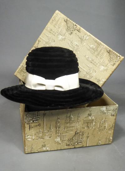 Collector's hat in felt ribbed with plush concentric bands from the Atelier Lucas for Harrods, a famous London luxury store dating from the 1970s. Hat with high round skullcap, wide shapeable edges and large silk Grosgrain ribbon with side braid. Handcrafted creation of a luxury hat maker with his original vintage Harrods box covered with famous monuments in London. The French will appreciate the nod to Madame Geneviève de Fontenay. Never or little used. No trace of use. Excellent condition of color and conservation.