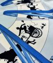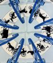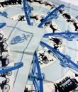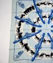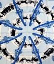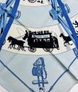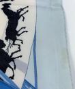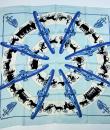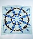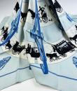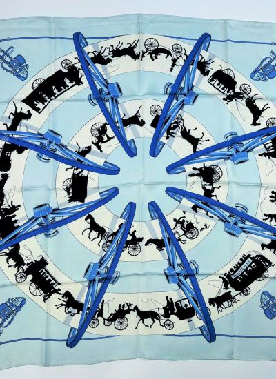 Hermès Scarf entitled "Paris qui Roule" in a design by Hugo Grygkar, the first edition of which dates from 1951, this being the second edition dating from 2006. Fluid printed silk twill with hand-rolled edges in shades of sky blue, white, black and dark blue. Concentric designs of stagecoaches and carriages loaded with people in 19th century costumes. In starry perspective, seven large carriage wheels. Hermès Paris can be read in one corner. No major defects to report, apart from a few tiny marks (see the last three photos), which are very difficult to observe.  No holes or large stains. Good colour and condition.