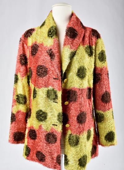 Rare iconic plush acrylic jacket by Issey Miyaké presented during the Winter 1998 collection fashion show. Light plush with long hair and large red and yellow checks dotted with large black polka dots. Loose fit with shawl collar closed in front with three yellow buttons. Mouse-gray nylon lining and original Issey Miyaké label. No defects, probably little or not used. Excellent condition of color and conservation.