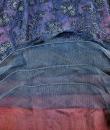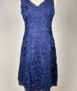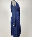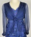 Cocktail dress in navy silk tulle embroidered with floche silk and its bolero by Jacques Heim Jeune Fille directed by Jacqueline Citroën and dating from the 1960s. Short dress, sleeveless, V-neck and zip in the back. Transparency effect between the purple nylon lining and the navy silk tulle finely embroidered with large flowers. At the bottom of the skirt, three layers of tulle with gradient piping are superimposed. A bolero, or cache-coeur, in matching silk crepe, embroidered at the cuffs and shoulders, is elegantly tied in front. Cotton bolduc numbered on the back with the label 8006, and bolduc on the waistband of the bolero indicating GW 38. No defects. Very good condition of colour and conservation.