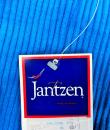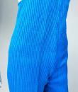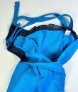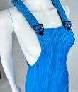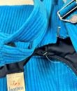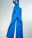 Blue corduroy ski overalls from Jantzen dating from the 1970s. Plastron tightened by straps with black plastic loops. Close-fitting, elephant-leg cut with clearly defined pleats and blue Kway tightening tabs with elasticated ankles. Left zip fastening. Original cardboard label confirming mint condition and stating Jantzen 60% acrylic 23% polyamide 15% wool 2% elastane. as new, never used. Excellent colour and condition.