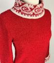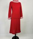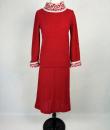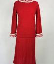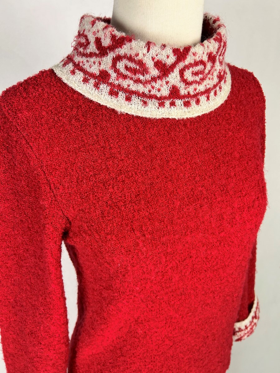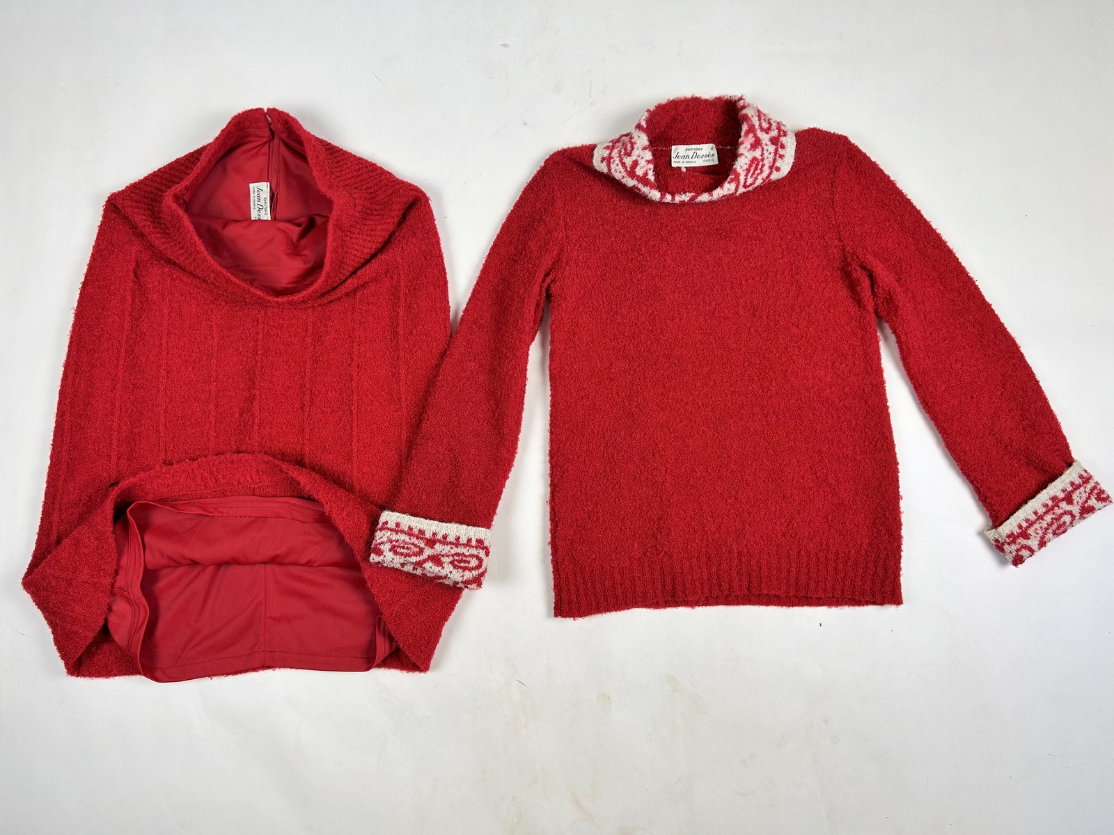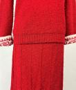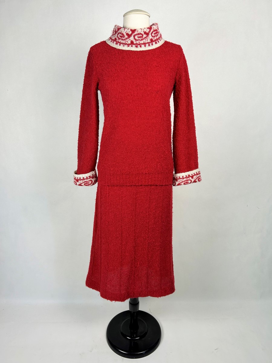A set comprising a sweater and skirt in knitted mohair, in ‘Santa Claus’ red by Jean Dessès, bearing the Sweaters label, his last ready-to-wear line around 1965, before his company closed in 1968. An iconic, cosy and vintage ensemble in wool and acrylic mohair, scarlet red (45% mohair, 55% acrylic). Long-sleeved jumper with a white and red mock roll neck and matching cuffs. The straight skirt is form-fitting and zipped at the back, with a matching red acrylic underskirt. The label on the jumper reads Sweaters, Jean Dessès, Made in France, Paris. No flaws to report apart from a slight natural patina due to its age. Good condition.