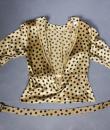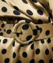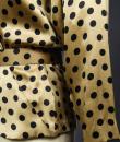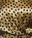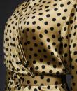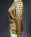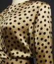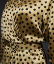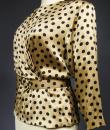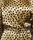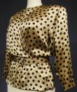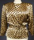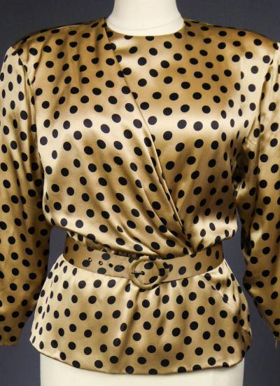 Jean-Louis Scherrer blouse or top in champagne silk satin with black dots. Long sleeves with zip at the wrists and epaulettes. Crew neck collar with shawl draped effect and crossed from the shoulder. Size tightened by an elastic and masked by a belt with matching buckle and lined with beige leather. Closure at the back by zip and hook. Beautiful fluidity of silk satin. Label white background black graphics JLS Boutique Scherrer Paris. Excellent condition of color and conservation.