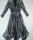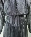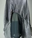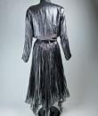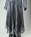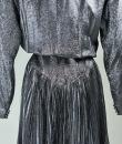 Disco ball gown by Jean-Louis Scherrer Boutique numbered 302451 in silver silk and polyester lamé. Blousante dress with batwing sleeves and Mao collar with a plunging slit on the chest. On the hips, a V-shaped cut-out is held in place by an inner elastic waistband (a little distended). Pleated skirt mounted with flat pleats that unfold into large pointed skittles at the bottom of the dress. Dress complete with matching ball buttons on the front, collar and cuffs. Small epaulettes accentuate the shoulders and zip on one side. Skirt lined with black crepe. Clean dress with no apparent flaws. Very good condition of colour and conservation. Disco atmosphere of the 1980's guaranteed!