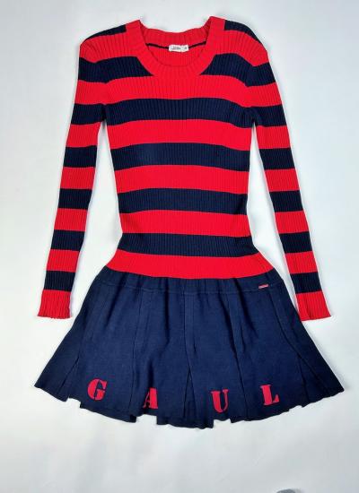 Navy mini-dress in ribbed cotton knit from Jean-Paul Gaultier's Junior collection dating from 2000. Stretch dress with a form-fitting silhouette, oval collar and long sleeves. Treated with wide navy and red horizontal stripes (which slim the silhouette) in the usual humorous and playful way of this French designer who thwarts codes! A low-waisted navy mini skirt in gladiator style, with the name GAULTIER emblazoned in red flocked letters on each sewn panel. Junior Gaultier label, aged 16. No flaws. Good colour and condition.