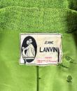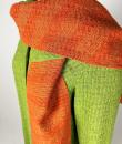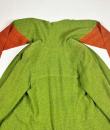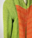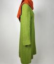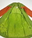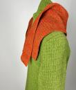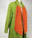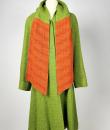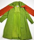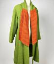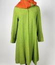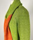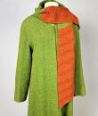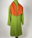 Haute Couture afternoon coat by Jeanne Lanvin in absinthe green mottled wool knit underlined by an orange scarf, integrated into the neckline. Straight cut, long sleeves, fastened with a press stud in front. Fine topstitching on the armholes, cuffs and scarf, specific to the work of Jeanne Lanvin. Famous logo stamp indicating Summer 1934 Jeanne Lanvin Paris 22 Fbg St Honoré (tears in the stamp) and a cotton bolduc on the back numbered 44070. The absinthe green silk crepe lining is flawed in several places, probably due to chemical degradation of the iron-laden silk. No stains or holes in the wool. Very good condition apart from the lining. Collector's item.