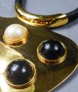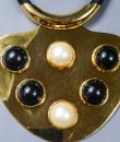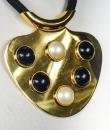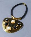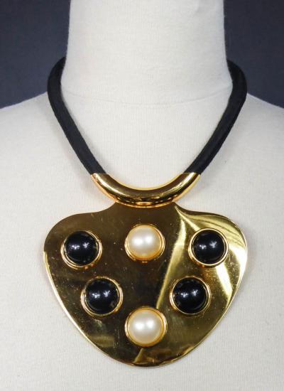 Imposing and iconic pendant necklace by Lanvin from the early 1970s of the Space Age period. Large crew-neck medallion in shiny golden brass in the shape of drop. Cabochons of large half beads in black and pearly bakelite, rimmed with golden brass. Thick cord in rubber with black wool stretch and brass clasp. Engraved label in metal on the back of the necklace indicating Lanvin Paris. Very nice object of collection. Modernist effect guaranteed! Some micro-scratches really imperceptible otherwise very good condition of color and conservation.