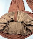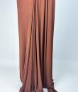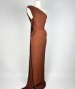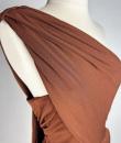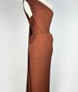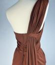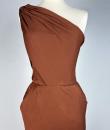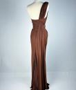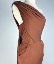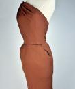 Haute Couture evening dress in chocolate brown stretch silk jersey by the famous Maison Jeanne Paquin, 3 Rue de la Paix, Paris, directed by Antonio Del Castillo and dating from the late 1940s. A long dress with the neo-classical drape typical of this period, as Madame Grès used the same type of jersey. Top draped asymmetrically over one shoulder, falling into a stole in the back and held in place by a pass to the bodice. Skirt with sheath-shaped and mini-train, emphasised at the hips by slit pockets. Whalebone bodice with black cotton bias binding and grosgrain inner waistband. Stapling at the back of the bodice with zip fastening. Lighter brown artificial fibre taffeta lining with matching underskirt. Cream satin label with black lettering indicating Paquin, 3 Rue de la Paix Paris. A few tiny moth holes, notably at the bottom of the stole and skirt. No major defects apart from a slight period patina. Good general condition of colour and conservation.