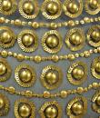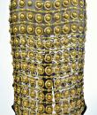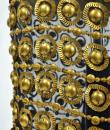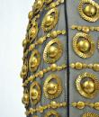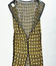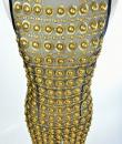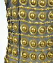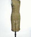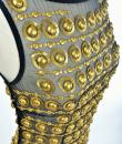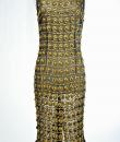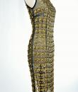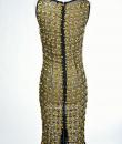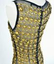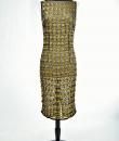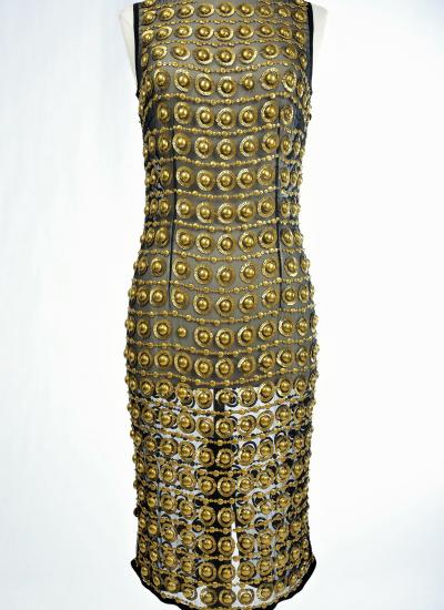 Beautiful evening dress by John Richmond the famous British designer based in Milan and dating from the years 2000. Sleeveless, black silk chiffon dress entirely embroidered with cabochons and sequins in copper metal (brass?) with concentric designs. Zip in the back and slit behind, it requires a body or an underdress. Dress with superb fall given the weight of metal embroidery. John Richmond label, 100% silk, made in Italy. The side darts are slightly distended but clean, no holes. Good condition of color and conservation.