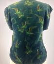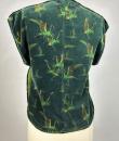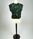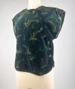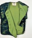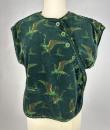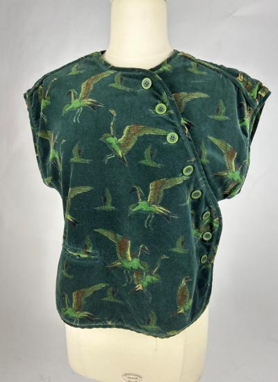 Rare Japanese-print velvet bolero from the early days of Kenzo Takada and his first brand Kenzo Jap dating from the 1970s. Sleeveless wrap-around bolero with kimono cut-out at the shoulders, in bottle-green velvet printed with cranes in flight. Side cross buttoning with eight green plastic buttons. Lining in lighter green wool crepe with Kenzo Jap label, Made in France, size 38, with medallion depicting young Kenzo. There are six tiny holes in the lining at the bottom corner of the bolero, the only flaw to be noted. Clean and in good condition.