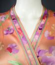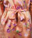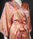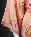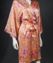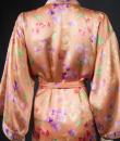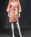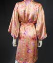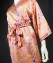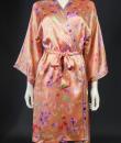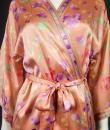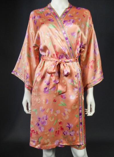 Elegant interior robe in printed silk satin from the house deisgner Léonard. As new, never worn, with its original label dating from 2006. Beautiful 100% salmon pink silk satin printed with Japanese flowers in a shades of pastel colors and Leonardo graphics. No lining, two side pockets and internal link to tie for crossing the robe. Matching belt and loops. Original label in cardboard mentioning Leonard Lingerie Size 38. Excellent condition of color and conservation.
