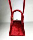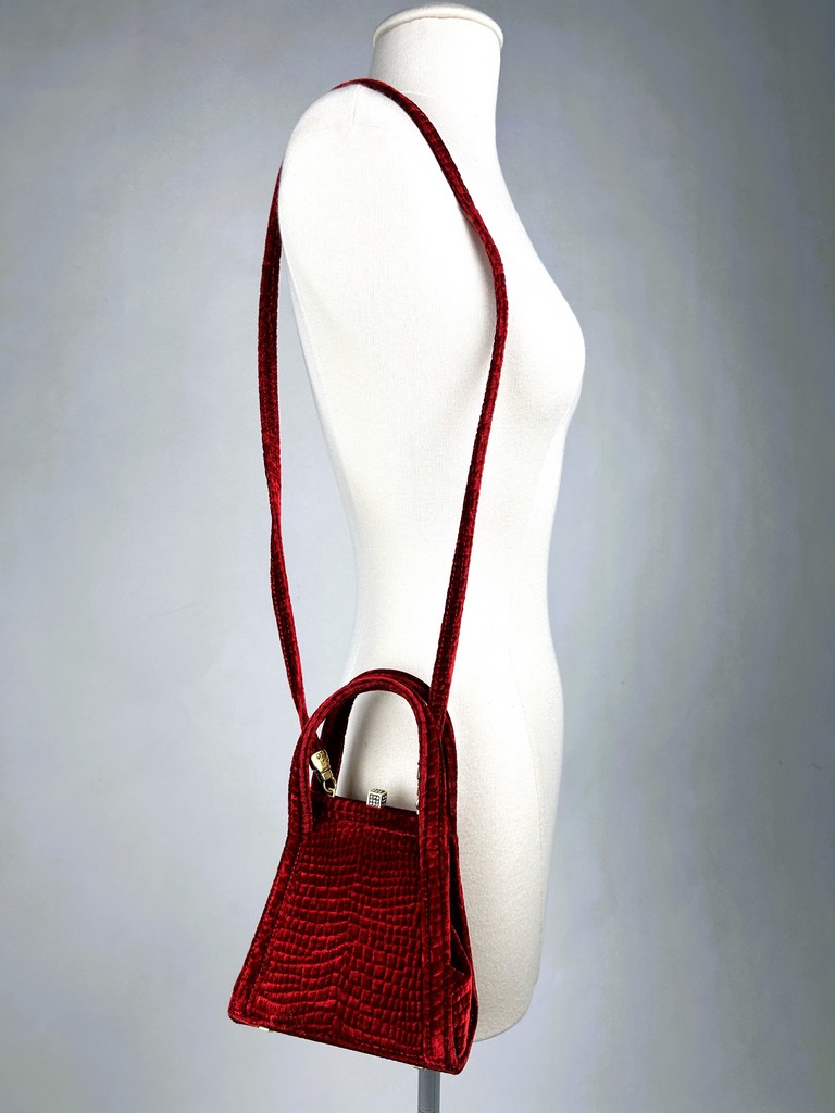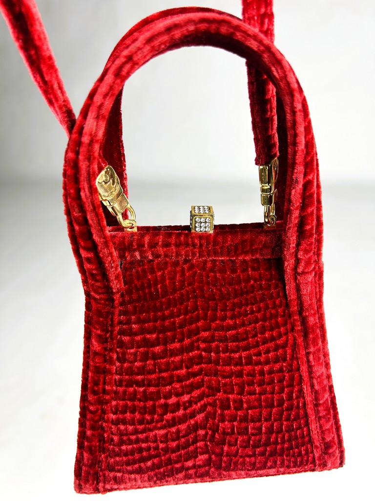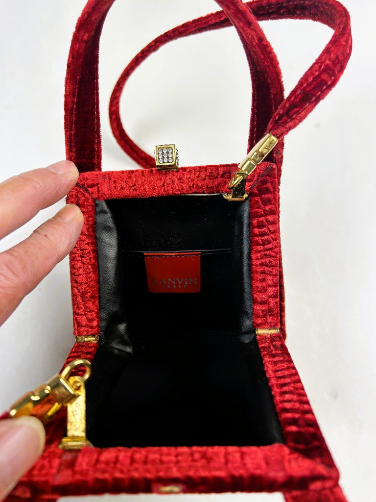 A precious minaudière, a small evening bag with handles and a shoulder strap from Lanvin, dating from the 1980s-1990s. Cardinal red silk velvet, embossed with small crocodile-style relief patterns. This small trapezoid-shaped minaudière has hinged gussets in gold-plated metal and a cube-shaped jewellery clasp entirely set with rhinestones. Two gold-plated metal clasps for the shoulder strap, which can be removed depending on use. Black vinyl canvas lining with red square engraved with Lanvin Paris, made in Italy. No flaws to note apart from tiny crease marks on the corners, this vintage clutch bag must not have been used much. Very good overall condition in terms of colour and preservation.
