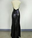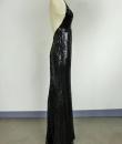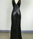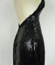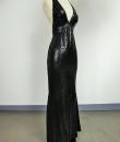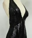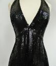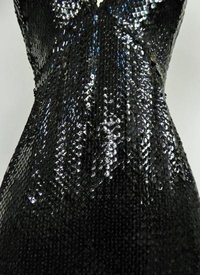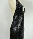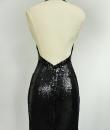 Loris Azzaro Haute Couture evening dress embroidered with black sequins dating from the 70's. Entirely embroidered with black sequins superimposed like fish scales. Skin-tight dress and halterneck with large V-neck in the back. Plunging neckline and tie of the dress at the level of the neck by two hooks. Zip closure at the back. Black silk crepe lining sewn entirely by hand. Label white background black graphic Loris Azzaro Paris Made in France. Excellent condition of color and conservation.