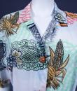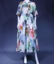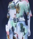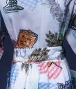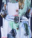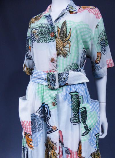 Dress in printed polyamide in the provençal style by Louis Féraud and dating from the 1970s. Short-sleeved model, a matching belt buckle and a wide skirt lining. Opening on the front with matching resin buttons. Provencal impression of ear of wheat, grapes and spices. Excellent condition of color and conservation