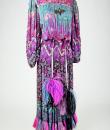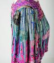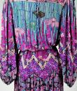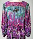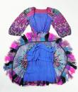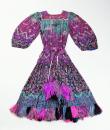 Amazing evening dress in embroidered silk chiffon by Louis Féraud Haute Couture from the 1981-1982 collection. Loose blousante dress with puffed sleeves and epaulets, in silk chiffon densely embroidered with iridescent sequins, glass beads and rhinestone cabochon (embroidery by Elie Jacqueline). Dominantly blue-oil, purple and mauve with floral design of iris reminding us of the borrowing of the designers to the French Impressionist painting. Waist belted with two silver vinyl panels finished with ostrich feather tassels with reminder at the bottom of the dress. Fully lined with purple muslin and black claw, white graphics Louis Feraud. No defect. Very good condition of color and conservation.
