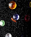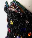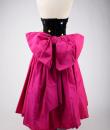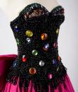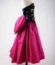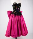 Flamboyant evening gown, taken from a fairy tale, by Louis Féraud Haute Couture from the 1986-1987 collection. Bustier with plunging neckline bare back, entirely embroidered with jet beads, with large multicolored glass cabochons and rhinestones, simulating the stars of a starry night! Fuchsia taffeta princess puffy skirt, Shocking Pink, large bow tied in the back and matching sheath underskirt. Rows of jet pearls and rhinestones highlight the waist of the bustier which is designed as a corset and is lined with black taffeta. Adjustable waist and padding at the chest.  Louis Féraud label. No defect to note, clean and flashy! Very nice condition of color and conservation.