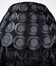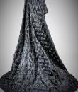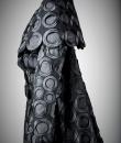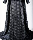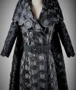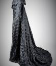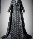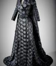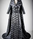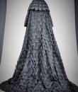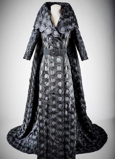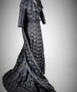 Masterful black wool coat dress (look 14) by Julien MacDonald for Givenchy in 2003. Inspired by 18th century coats, the bottom is made of double black faille fabric covered with a wool felt with large black embroidered perforations. Tubular three-quarter sleeves, wide theatrical folded collar and coat crossing closed in front by hooks. Two side slits allow a felt belt to be passed through to curve the coat in front while freeing the volume at the back ending in a train, in the manner of the French Dresses! Black taffeta lining. No defects. Very good condition of color and conservation.