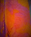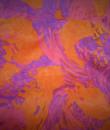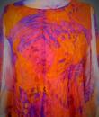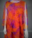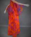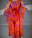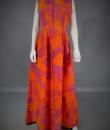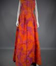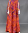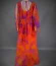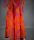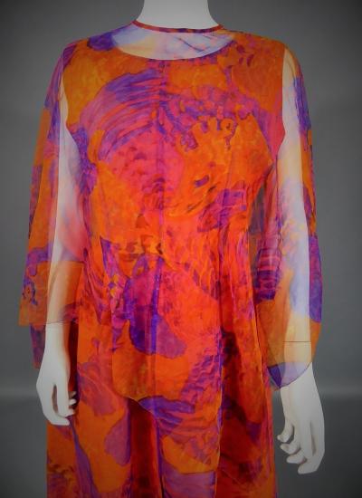 Long sleeveless Haute Couture dress by Madame Grès. Bottom of the orange dress on which is sewn a chiffon printed with large abstract flowers orange and purple. Structured interior at the waist. Shape of the flared skirt in tulip chasuble style. Darts and piping visible in violet color. Capeline is wide and transparent in the same fabric as the dress, attached to the back by a small snap button. Zipper on the right side. Inside, white label with inscription in black Grès 1 rue de la Paix Paris.