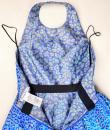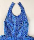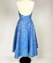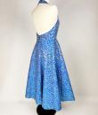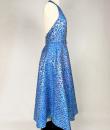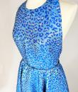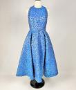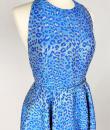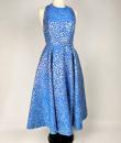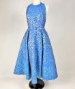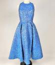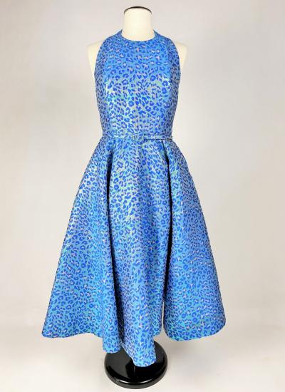 A long dress by Maria-Grazia Chiuri for Christian Dior - look no. 67 from the 2021 collection. A sleeveless dress with a large bare back and a stapled choker at the back of the neck. Glamorous effect achieved by shaping (polyester and silk) iridescent blue and parma lurex like a panther skin. The skirt has large flared panels to give it plenty of room, in a nod to Christian Dior's 1950s genius. A very fine belt with matching buckle completes the line of this dress. No lining, inner waistband in black grosgrain and back zip. Label indicating Christian Dior Paris made in France. Very few threads pulled, dress little or not worn. Good overall condition.