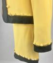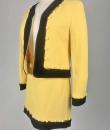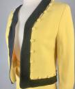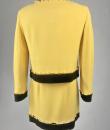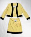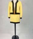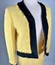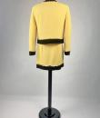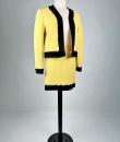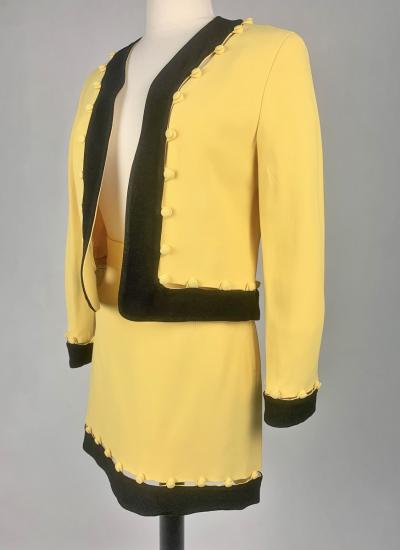 Iconic cocktail skirt suit by Moschino for Cheap and Chic dating from the period of Monsieur Franco Moschino, who passed away in 1994. Fitted jacket in banana yellow crepe, collarless with long sleeves. The bolero is highlighted around the edges with a black crepe band with yellow buttoned tabs on the jacket. The mini skirt is short and straight, with an integrated buttoned belt and side zip. The ensemble is fully lined in yellow nylon taffeta, with the skirt and bolero featuring the famous Cheap and Chic Moschino woven label. Made in Italy. The ensemble is clean and without any apparent flaws. The colour and condition are excellent.