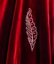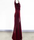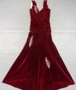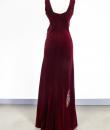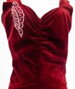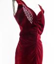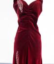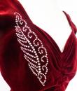 Rare long collector's evening dress, French Haute Couture by Nicole Groult, famous sister of Paul Poiret and dating from the 1935s. Sleeveless dress in carmine red silk velvet underlined with Swarovski rhinestone embroidery with Indian palm leaves. Elegant centered pleats emphasizing the bustier on the shoulders. Dress lined in champagne satin, without zip or side opening and beautiful cream grosgrain label embroidered with "Nicole Groult, 25 Faubourg Saint Honoré". No flaw. Excellent condition of color and conservation.