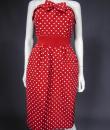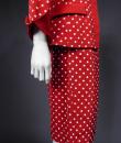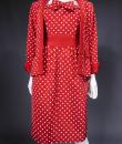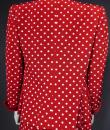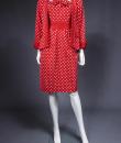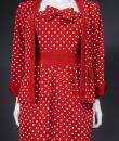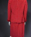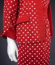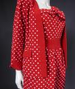 Dress and jacket set Nina Ricci from the 80s in red cotton ottoman printed with white dots. Sheath dress with 2 pockets in bias on the hips. Bustier with lapels and large bow on the chest. Jacket with lapel effects on the sleeves with two flap pockets and small shoudel pads. Nylon lining. Label Nina Ricci Shop Paris Made in France inside the jacket. Excellent condition of color and conservation.
