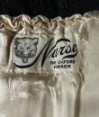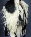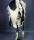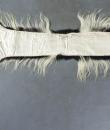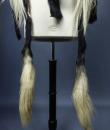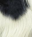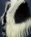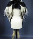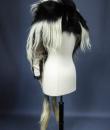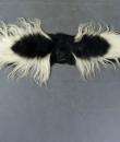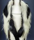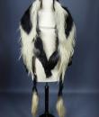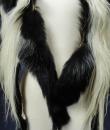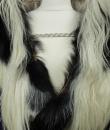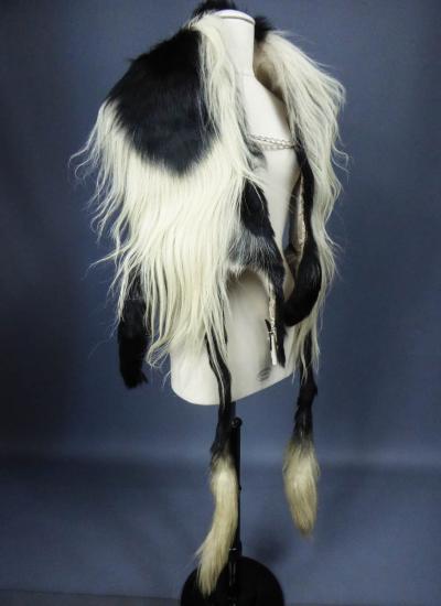 Amazing two-tone capelet or neckerschief in white and black Columbia monkey fur from the british designer house Nurse. Very long white fur. Capelet ending in two tails and four tabs. Closure at the front with a chain and crocheted hook in cream silk threads trimmings.Long brown horn clip at one end bearing its original handwritten label. Cream satin lining with a matching bouillonné at the ends. Label Nurse The Oxford Furrier. Lining very slightly frayed by very localized place. Otherwise very clean, shiny and supple fur in excellent condition.