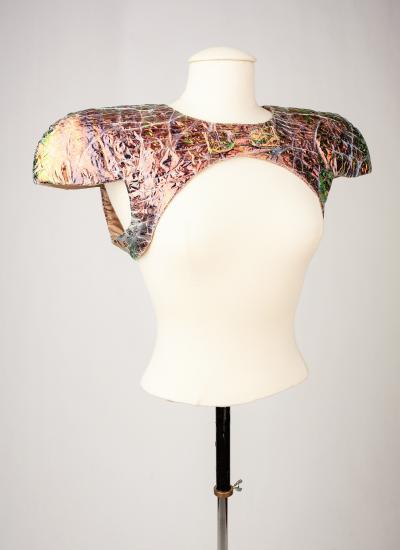 Iconic quilted Bolero with fins in "Papier Fou" by Paco Rabanne Haute Couture dating from the first edition of 1981. This famous model is taken up by the Couture House in 1988, then in 1991 (look No. 21 of the 1991 show). Short bolero with front closure by two snaps and decorated with a matching bow tie. It is a synthetic material crumpled paper, revolutionary for the time, in silver and iridescent Tivek color of the Rainbow! Lining in raw taffeta and claw Paco Rabanne Paris. Some stains on the lining and patina of use of the Bolero with some cracks. Stable material. Good condition.
