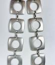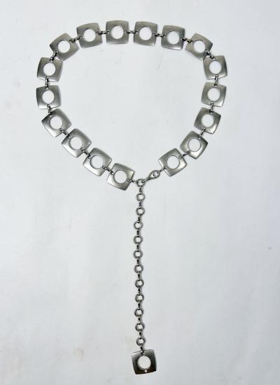Prototype belt by Paco Rabanne (attributed to) with brushed metal discs dating from the late 1960s. Large square links with large circular perforations, connected by hand-made hooks. Adjustable belt with a long chain falling down the front, in the style of the Saharienne fashion of the same period. No Paco Rabanne label, but typical of the couturier's craftsmanship, who often did not sign his work, especially his prototypes. Note the natural patina of the brushed metal, which should be cleaned from time to time. No flaws. In good structural condition.