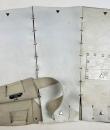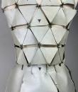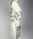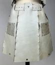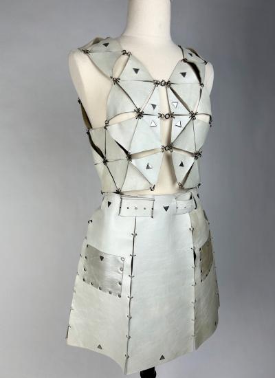 Outfit in leather by Paco Rabanne, mini-skirt and open bolero with triangular ivory leather cut-outs held in place by metal rings. Skirt with flared panels appliqué with silvered pockets and brushed steel triangular studs, with an echo on the bolero and pass belt. Paco Rabanne, Paris paper Label signature on the inside of the belt. Slight patina of the leather and dust on the inside of the leather, otherwise no major defects. Good overall colour and condition.