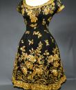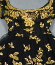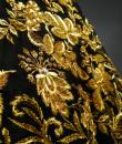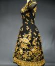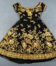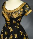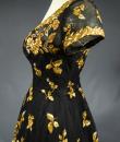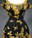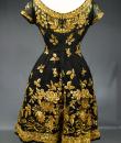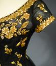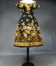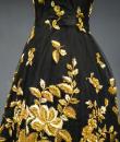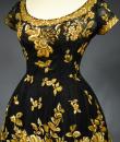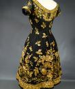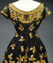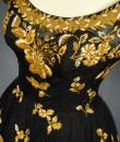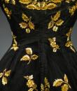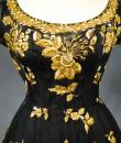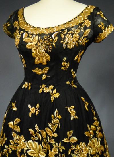 Haute Couture Cocktail Dress by Pierre Balmain from the wardrobe of Mrs Augier, owner of the Palace Negresco in Nice on the French Riviera. Babydoll type dress in black silk tulle densely embroidered with bouquets of flowers and seedlings by the Maison Rébé or the Maison Lesage. Gold embroidery in silk thread and lurex thread , decorated with cannetilles, pearls and cabochons with applied muslin.  Dress with short sleeves, boat neckline and round skirt with four petticoats, three of which are in black tulle and one in stiff canvas taffeta. Black taffeta lined bodice with wire underwire for the bust. Black woven label, white lettering indicating Pierre Balmain Paris and a cotton bolduc numbered 109646 on the back. No flaws to note, except for the bodice zip which has been changed. Excellent condition and color. Wearable today.