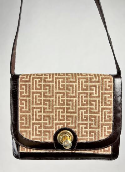Famous shoulder bag or handbag with the Labyrinth monogram designed by Pierre Balmain in the early 1970s. The 1971 haute couture fashion show marked the debut of logos in fashion, here with graphics inspired by Renaissance gardens, where we can recognize the P for Pierre or Paris and the B for Balmain! Rectangular bag with three gussets and a flap on the front closed by a swivel brass button. Wool canvas printed with the Labyrinth monogram, highlighted with brown leather with impeccable finishes. Gold label printed on the inside indicating Pierre Balmain Paris Made in France. Adjustable shoulder strap or handbag handle. The interior is made of split leather and brown glossy leather with a zipped pocket. No defects, no scratches on the corners. No signs of use. Very good overall condition in terms of color and preservation.