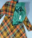 A historical model, a Maxi Chasuble Dress in thick tartan by Pierre Cardin Boutique. Slightly stretchy weave in large woolen knits with green, duck blue, ochre, brown and orange checks. Green bib with large bakelite buttons. Green taffeta lining. Topstitching on the bodice and three cuffs on the Mao collar. Zip in the back. Similar model reproduced on the cover of l'Officiel de la Mode n° 579 in 1971. Provenance from the Didier Ludot/Sotheby's Collection sale of 8 July 2015. Slight damage to the lining of the inner linings, otherwise no other defects. Good condition of colour and conservation.