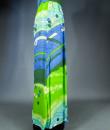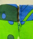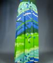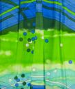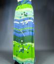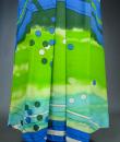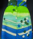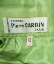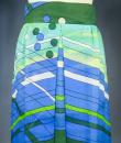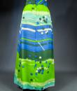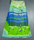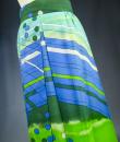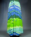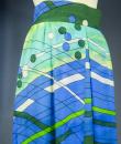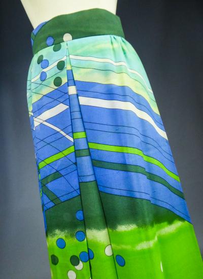 Long skirt by Pierre Cardin Paris Circa 1980. Silk crepe printed in a camaieu of green and blue with patterns of geometric lines and circles of Modernist taste. Large waist belt and large box pleats at the front giving the sweep to the skirt which attaches behind with zip and hooks. Lining of the skirt in light green nylon. Woven label indicating Creation Pierre Cardin Paris. Very good condition of color and conservation.
